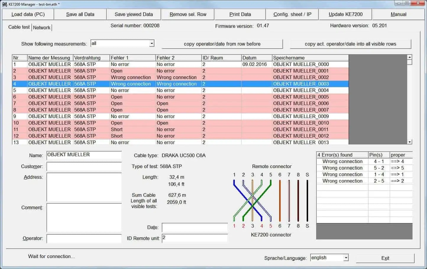 KE7200 sprawdza przewody i pary przewodów tras kablowych pod kątem ciągłości, przerwy, zwarcia, zamiany i rozdzielenia pary. W przypadku zwarć i przerw, KE7200 określa nawet odległość do miejsca usterki za pomocą precyzyjnej metody TDR. Dzięki konfigurowalnej przez użytkownika bazie danych kabli, nieznane kable i schematy okablowania należą już do przeszłości. KE7200 może zarządzać maksymalnie 32 jednostkami zdalnymi. Korzystanie z wielu jednostek zdalnych oszczędza czas i odległości, a tym samym skraca czas pomiaru u klienta.