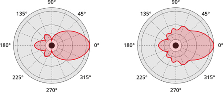Figure 4 shows the antenna diagram of a wall antenna. This antenna has clear directional characteristics and, when installed correctly, radiates towards, for example, offices or the hall. The side mounted to the wall, in the diagram on the left, is strongly attenuated.