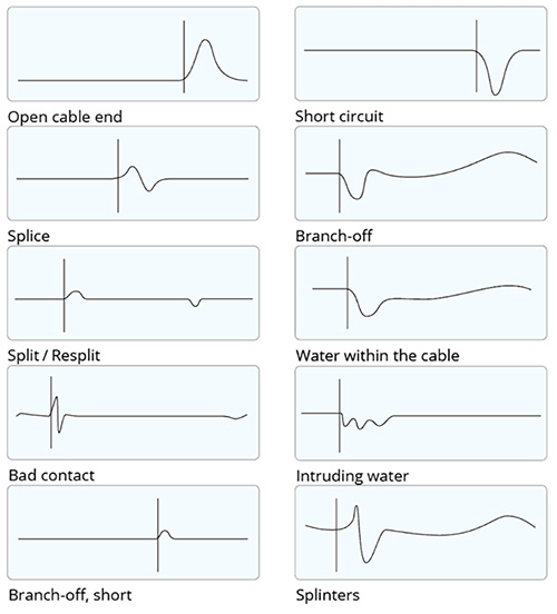 With the TDR method, the device sends a pulse onto the cable, which is then reflected by cable faults and sent back to the device. The type of fault can be identified by characteristic reflection curves. The instrument also indicates the location of the fault to an accuracy of approximately 0.3 m. Some typical reflection curves and the associated cable faults are shown in the figure below: